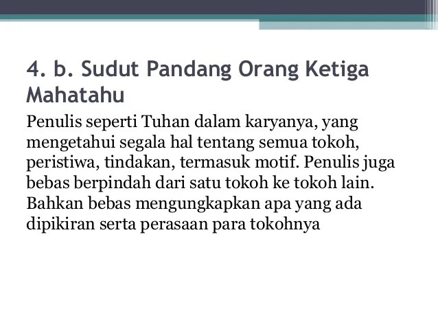 Dia menjadi pusat atau tokoh sentral dalam cerita. Sudut pandang orang pertama, sudut pandang orang kedua, dan sudut pandang orang . Sudut pandang orang ketiga menggunakan kata ganti "dia" dan "ia" untuk tunggal, atau bisa juga menggunakan nama . Contoh cerpen sudut pandang orang ketiga. Sudut pandang orang ketiga adalah kondisi dimana penulis meletakkan tokoh utama sebagai orang dengan kata ganti orang ketiga, yakni "ia" atau " . Contoh sudut pandang orang ketiga serba tahu :. Pada sudut pandang orang ketiga serba tahu, penulis akan menceritakan apa saja berhubungan tokoh utama. Nah, diatas adalah contoh gambar yang memakai sudut pandang orang ketiga. Di sini, pembaca hanya sebagai penonton, tidak memainkan peran. Contoh narator untuk sudut pandang orang ketiga serba tahu subjektif yang paling terkenal adalah tokoh lemony snicket pada serial novel a series of unfortunate . Juga untuk sudut pandang orang ketiga atau pengamat. Sudut pandang orang ketiga sebagai pengamat ini mirip. Tokoh agam dalam novel pulang karya tere liye.